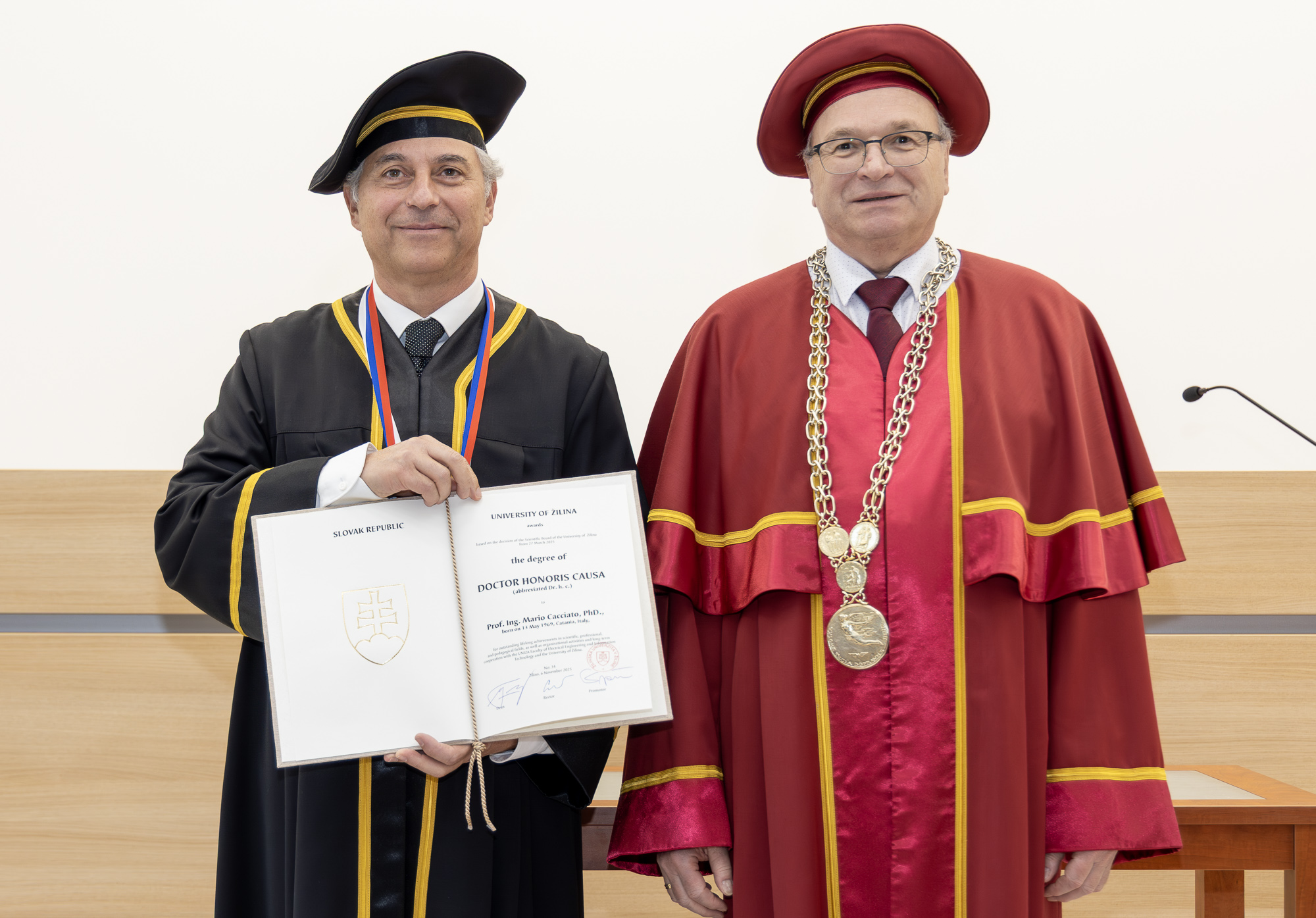 Na novembrovej slávnostnej časti Vedeckej rady Žilinskej univerzity v Žiline rozšírenej o Vedeckú radu Fakulty elektrotechniky a informačných technológií boli odovzdané atribúty titulu „doctor honoris causa“, diplom a medaila prof. Ing. Mariovi Cacciatovi, PhD., talianskemu vedcovi, pedagógovi a dlhoročnému zahraničnému spolupracovníkovi univerzity v oblasti výkonových elektronických systémov. V júni 2025 boli odovzdané atribúty tohto titulu, diplom a medaila aj prof. Ing. Robertovi Čepovi, PhD., dekanovi Fakulty strojí VŠB – Technické univerzity Ostrava, za jeho rozvoj poznania v oblasti strojárstva, publikačnú činnosť a dlhoročnú spoluprácu so Strojníckou fakultou a UNIZA. Súčasne na novembrovej Vedeckej rade boli odovzdané atribúty titulu „profesor emeritus“ prof. Ing. Antonínovi Kazdovi, CSc. za jeho dlhoročnú prácu v oblasti plánovania a prevádzky letísk a bezpečnosti leteckej dopravy. Obom laureátom prajeme dobré zdravie a veľa tvorivých impulzov na prácu vo vede i vzdelávaní.